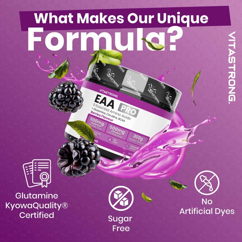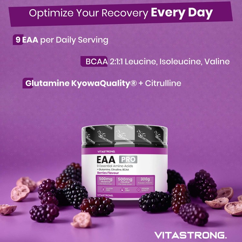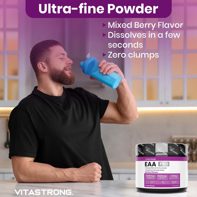 Vitastrong EAA Pro unterstützt den Körper in verschiedenen Trainingsphasen, von der Ausdauer während der Anstrengung bis zur Erholung danach. Essentielle Aminosäuren sind für die Proteinsynthese von entscheidender Bedeutung, ein Prozess, der Muskeln nach intensiver körperlicher Aktivität repariert und aufbaut.