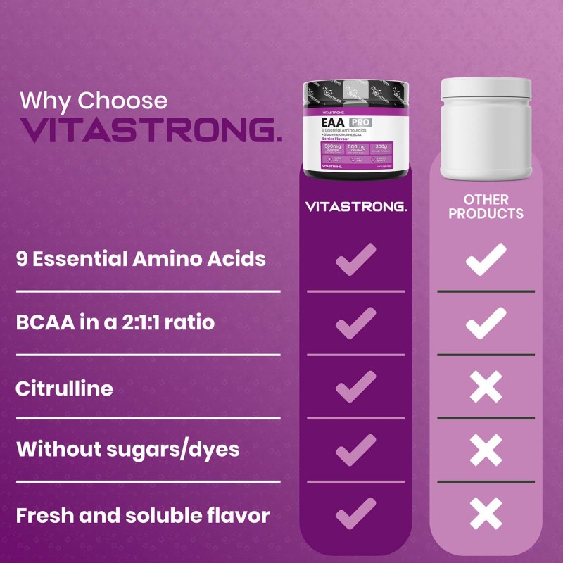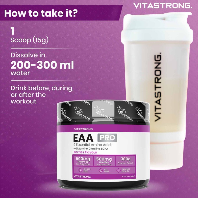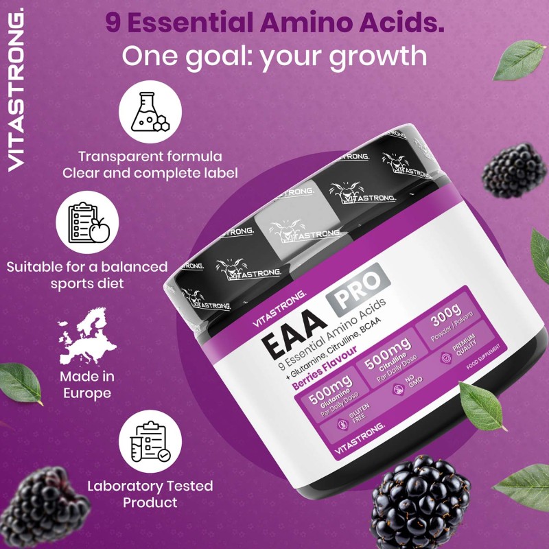 Vitastrong EAA Pro ist ein fortschrittliches Nahrungsergänzungsmittel mit essentiellen Aminosäuren in den Geschmacksrichtungen Zitrone, Pfirsich oder Rote Frucht, das speziell zur Deckung des Protein-/Stickstoffbedarfs entwickelt wurde und sich entsprechend auf die Muskelregeneration, das Muskelwachstum und die körperliche Leistungsfähigkeit auswirkt. Essentielle Aminosäuren (EAAs) sind grundlegende Bestandteile von Proteinen und unser Körper kann sie nicht selbst produzieren. Daher ist ihre Aufnahme über die Nahrung oder Nahrungsergänzungsmittel unerlässlich.