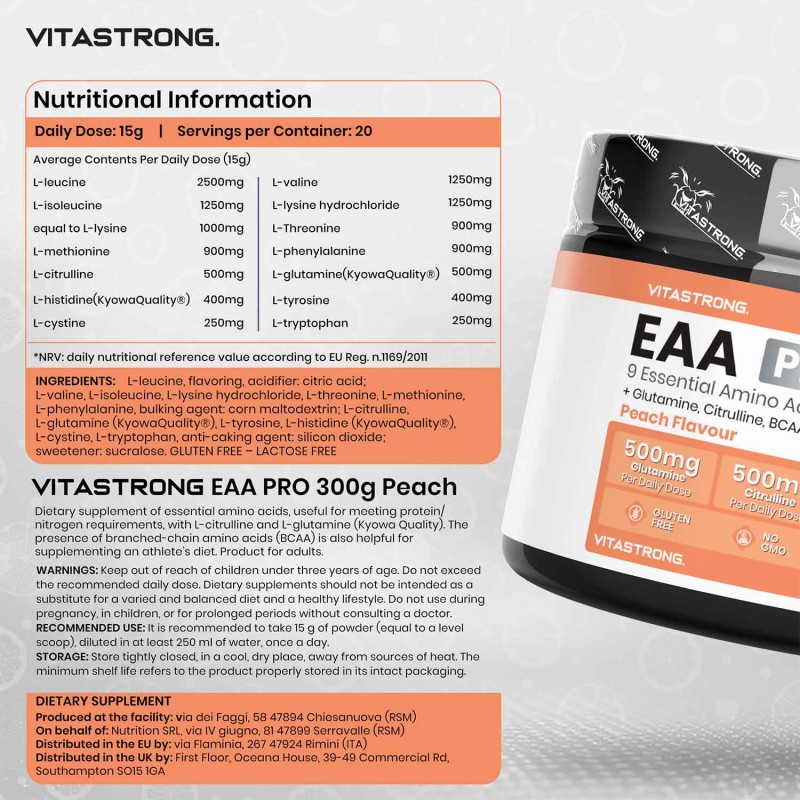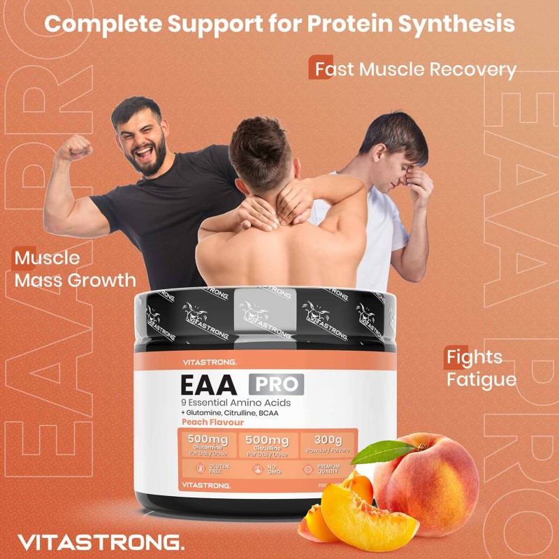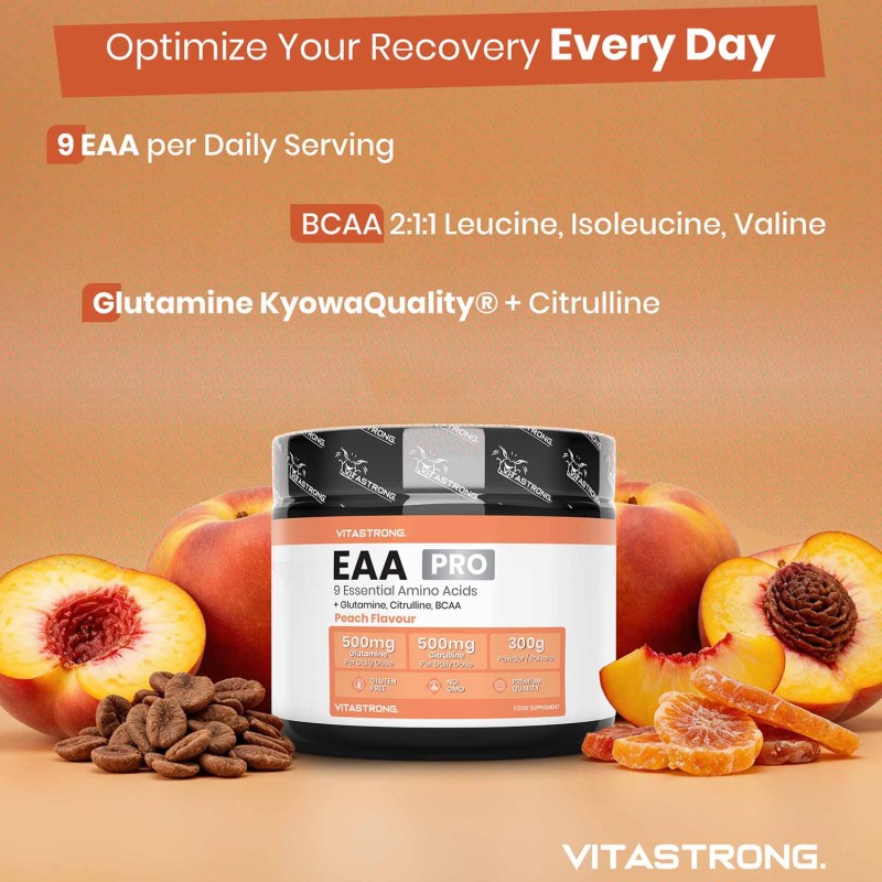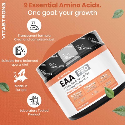 Vitastrong EAA Pro ist ein fortschrittliches Nahrungsergänzungsmittel mit essentiellen Aminosäuren in den Geschmacksrichtungen Zitrone, Pfirsich oder Rote Frucht, das speziell zur Deckung des Protein-/Stickstoffbedarfs entwickelt wurde und sich entsprechend auf die Muskelregeneration, das Muskelwachstum und die körperliche Leistungsfähigkeit auswirkt. Essentielle Aminosäuren (EAAs) sind grundlegende Bestandteile von Proteinen und unser Körper kann sie nicht selbst produzieren. Daher ist ihre Aufnahme über die Nahrung oder Nahrungsergänzungsmittel unerlässlich.