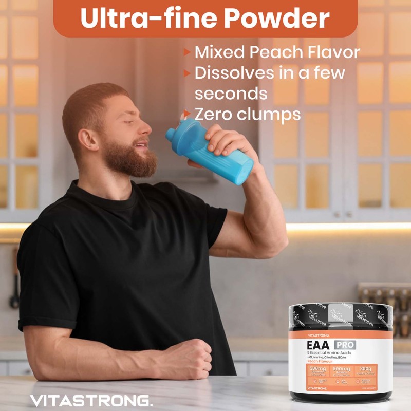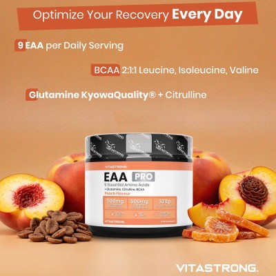 Vitastrong EAA Pro unterstützt den Körper in verschiedenen Trainingsphasen, von der Ausdauer während der Anstrengung bis zur Erholung danach. Essentielle Aminosäuren sind für die Proteinsynthese von entscheidender Bedeutung, ein Prozess, der Muskeln nach intensiver körperlicher Aktivität repariert und aufbaut.