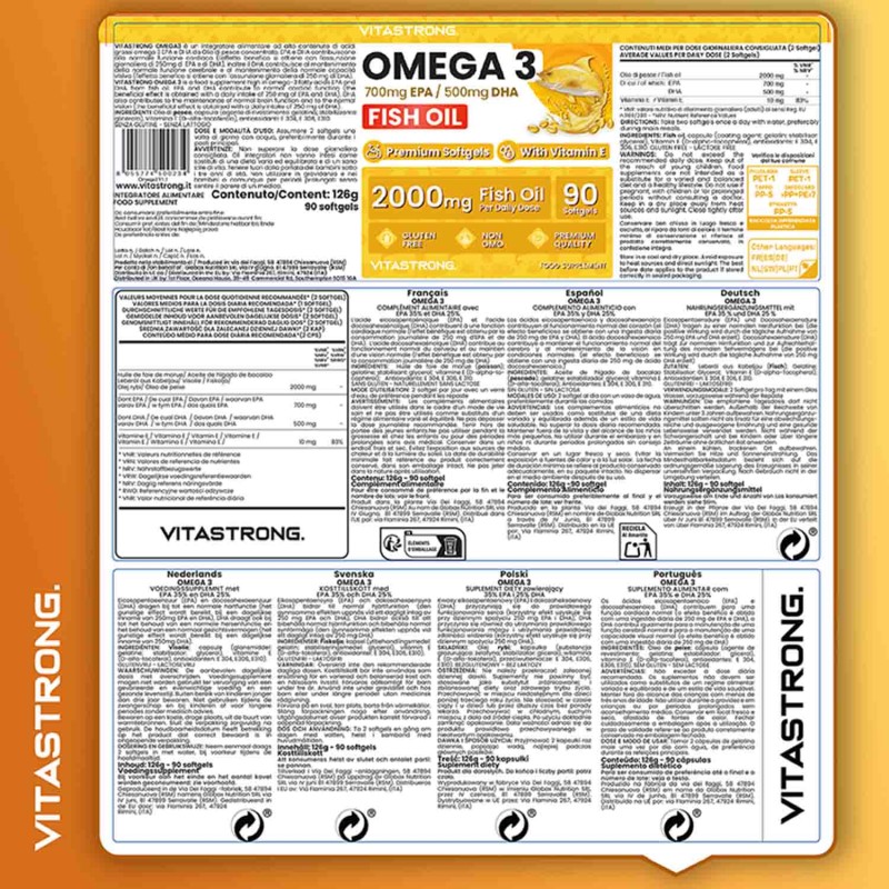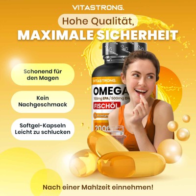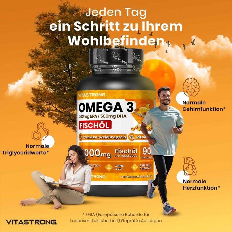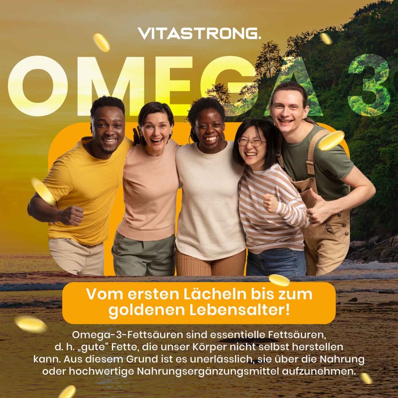Vitastrong Omega 3 ist ein hochwertiges Nahrungsergänzungsmittel mit Fischöl, das reich an EPA und DHA ist. Diese essenziellen Fettsäuren unterstützen die normale Funktion von Herz, Gehirn und Sehkraft und tragen so optimal zu Ihrem täglichen Wohlbefinden bei.