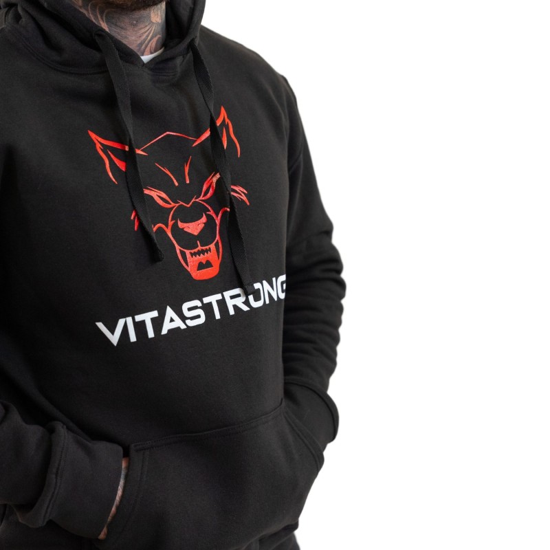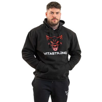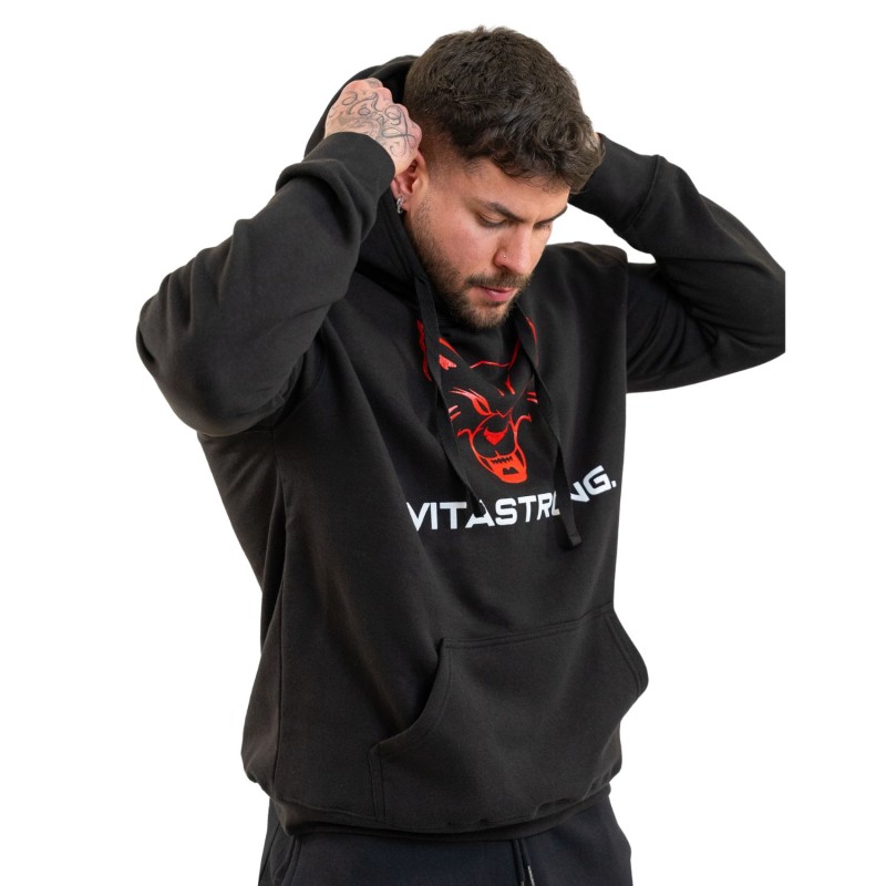 Der Flagship Hoodie in Schwarz ist das Kleidungsstück, das den Vitastrong-Stil begründete. Ein markantes Design, ein kontrastierendes Logo auf der Vorderseite und der rote Wolf, der das Bild dominiert: ein Symbol für Stärke, Zugehörigkeit und Identität.