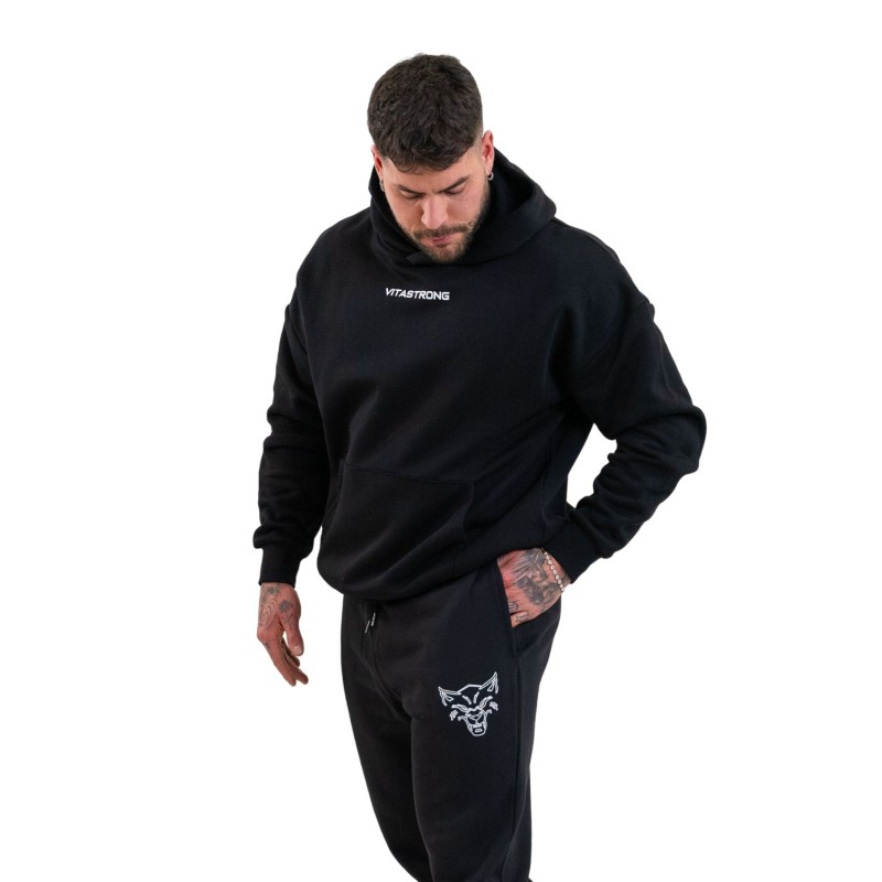 Der Origin Hoodie in Schwarz verkörpert den Vitastrong-Stil: klar, kraftvoll und kompromisslos. Ein Unisex-Sweatshirt mit Oversized-Passform aus hochwertigem Fleece für maximalen Tragekomfort.