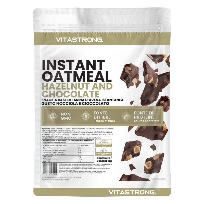 Vitastrong Instant-Haferflocken mit Haselnuss- und Schokoladengeschmack: eine Mischung aus authentischen Aromen und ausgewogener Ernährung. Hoher Ballaststoff- und Proteingehalt, mit dem Genuss von Schokolade und der Fülle von Haselnüssen. Saubere Energie und purer Geschmack!