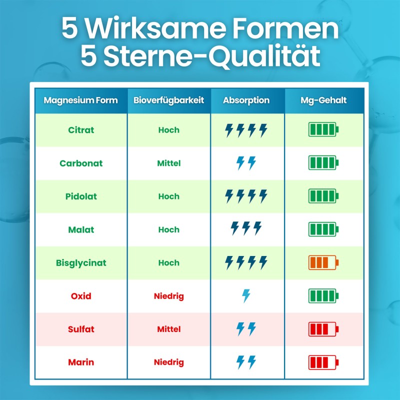 Im Vergleich zu herkömmlichen Magnesiumpräparaten bietet VITASTRONG eine einzigartige 5-in-1-Formel mit bioverfügbaren und leicht assimilierbaren Formen. Diese Kombination gewährleistet eine optimale Aufnahme und synergistische Wirkung für das allgemeine Wohlbefinden und ist daher ideal für alle, die eine umfassende Unterstützung für Energie, Muskeln und Knochen suchen.