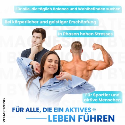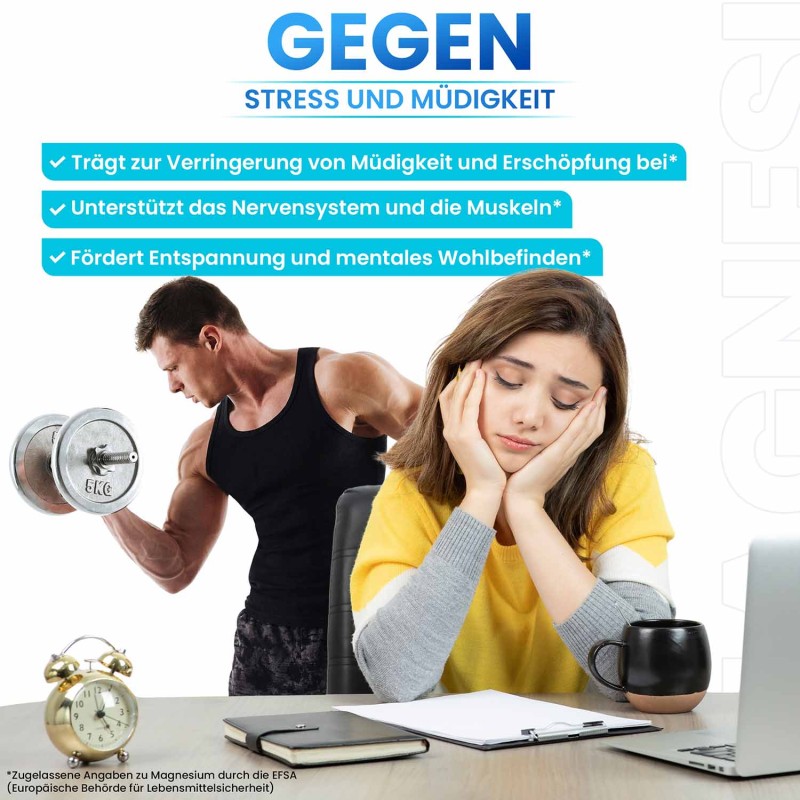Es ist insbesondere angezeigt bei Müdigkeit, Nervosität, Muskelverspannungen oder Energieabfall , wenn der Bedarf an Magnesium aufgrund von körperlichem oder geistigem Stress steigen kann¹.