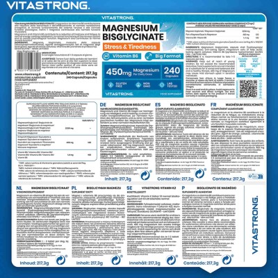 Zutaten: Magnesiumbisglycinat; Kapselhülle (Hydroxypropylmethylcellulose); Trennmittel: Magnesiumsalze von Speisefettsäuren; Füllstoff: Cellulose; Vitamin B6 (Pyridoxinhydrochlorid). GLUTENFREI – LAKTOSEFREI