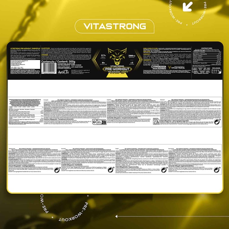 Zutaten: L-Citrullin, Beta-Alanin, Füllstoff: Sorbit; Säuerungsmittel: Citronensäure; Trennmittel: Siliciumdioxid; Koffein, Süßstoffe: Sucralose, Acesulfam K; Taurin, Säureregulator: Kaliumcitrate; Panax Notoginseng (Panax notoginseng (Burkill) FH Chen., Wurzel) Trockenextrakt, Aroma, AstraGin® (Extrakt aus Panax notoginseng und Astragalus membranaceus), Farbstoff: Riboflavin; Cyanocobalamin (Vitamin B12).