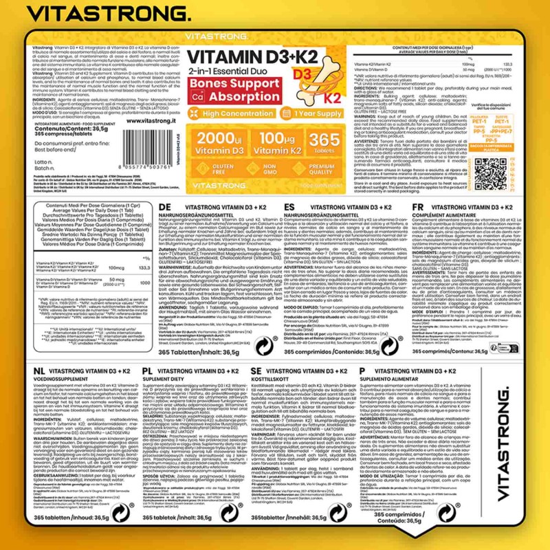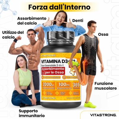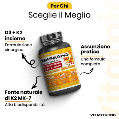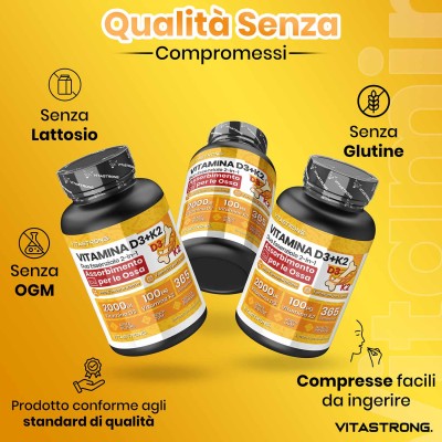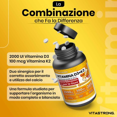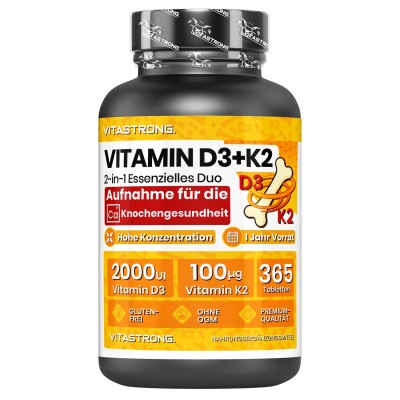 Vitastrong kombiniert 2000 IE Vitamin D3 mit 100 µg Vitamin K2 MK-7 , der idealen Dosierung zur Förderung einer effektiven Kalziumaufnahme , verbesserter Knochendichte und umfassender Unterstützung des allgemeinen Wohlbefindens .
