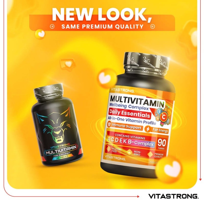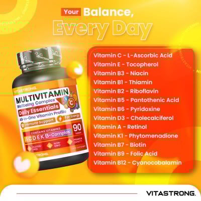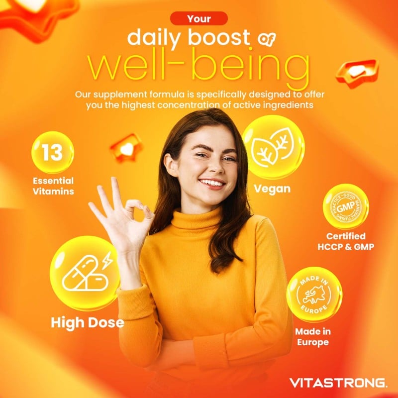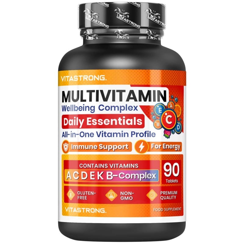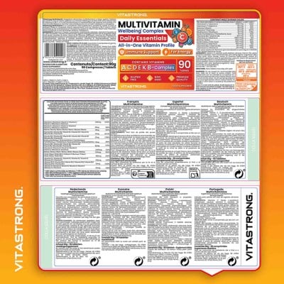 Vitastrong MULTIVITAMIN ist ein Breitspektrum-Multivitamin-Nahrungsergänzungsmittel, das für Erwachsene bei reduzierter Vitaminzufuhr oder erhöhtem Vitaminbedarf geeignet ist. Jede Tagesdosis enthält 1000 mg Vitamin C, 60 mg Vitamin E, 1200 mg Vitamin A, 48 mg Niacin, 18 mg Pantothensäure, 9,5 mg Vitamin B6, 25 mg Riboflavin, 25 mg Vitamin B1, 400 mg Folsäure und 450 mg Biotin , 105 µg Vitamin K1, 25 µg Vitamin D3 und 33 µg Vitamin B12