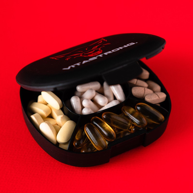 Die VitaStrong Pillendose ist die ideale Lösung für alle Sportler, die verschiedene Arten von Nahrungsergänzungsmitteln in Form von Pillen, Vitaminen, Mineralien usw. einnehmen.